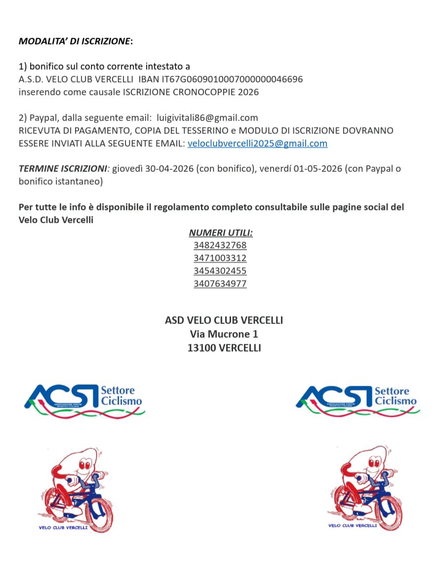 - Iscrizione: ISCRIZIONE: 18 euro ad Atleta o 32 a coppia (TRAMITE BONIFICO) Entro Giovedi 30/04/2026 19 euro ad Atleta o 33 a coppia (TRAMITE PAYPAL) Entro Venerdi 01/05/2026 PROMOZIONE COMBINATA ( INDIVIDUALE + COPPIE) 28 euro a coppie tramite Bonifico 29 euro a coppie tramite Paypal MODALITA' DI ISCRIZIONE: 1) bonifico sul conto corrente intestato a A.S.D. VELO CLUB VERCELLI IBAN IT03R0608510007000000046696 Inserendo come causale ISCRIZIONE CRONOCOPPIE 2026 2) Paypal, dalla seguente email: Questo indirizzo email è protetto dagli spambots. È necessario abilitare JavaScript per vederlo. Dopo aver effettuato il pagamento, inviare RICEVUTA DI PAGAMENTO CON LA COPIA DEL TESSERINO ALLA SEGUENTE EMAIL: Questo indirizzo email è protetto dagli spambots. È necessario abilitare JavaScript per vederlo.